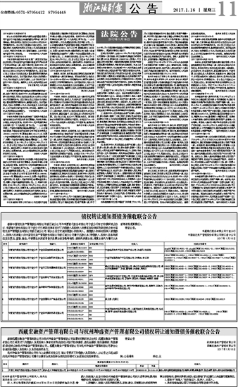 西藏宏融资产管理有限公司与杭州坤盛资产管理有限公司债权转让通知暨债务催收联合公告