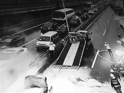 本报讯 昨天下午2点多,有市民来电称,杭甬高速萧山往杭州方向钱江二桥上三车追尾,有小车突然起火,火势非常猛。