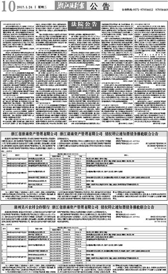 湖州吴兴农村合作银行 浙江省浙商资产管理有限公司 债权转让通知暨债务催收联合公告