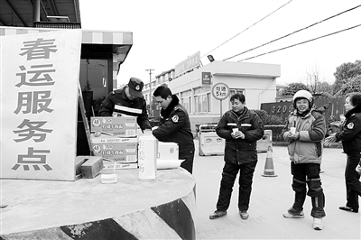 1月24日,衢州常山县公路管理局320国道衢州超限检测站的江建华、郑国良等路政人员,为过往的外来务工人员送上免费生姜茶、方便面,让他们可以在此歇歇脚。