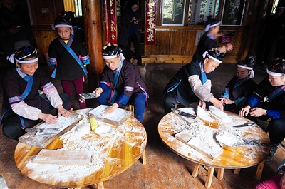 春节将至,广西柳州市三江侗族自治县侗族妇女纷纷赶制油果喜迎新春,村村寨寨洋溢着浓浓年味。侗族同胞一日三餐离不开打油茶,在春节前制作油果打油茶是侗族的一种传统习俗。油果由优质糯米经打粉、和面、切条、切丁,并用野生茶油油炸而成,是侗族打油茶不可或缺的佐料之一。