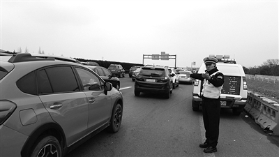 | 下午3点30分 下午3点30分,高速路段出现返程大流量,郑孟在匝道指挥车辆驶入主线 |