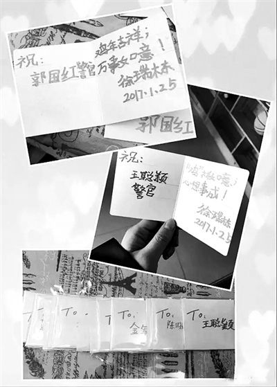 图中的贺卡是东阳市公安局佐村派出所所长徐伟峰的9岁儿子所写,他叫徐瑞栋。大年三十这一天,徐瑞栋给爸爸所里的每位民警叔叔都写了贺卡。