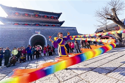 2月5日,山东潍坊青州市古城景区举行“非遗展演庆新春”活动,非遗传承人现场表演了抖空竹、捏面人、制糖画、草编等二十余种技艺,让人们在品味传统文化中欢庆新春。图为一名非遗传承人展示抖空竹技艺。