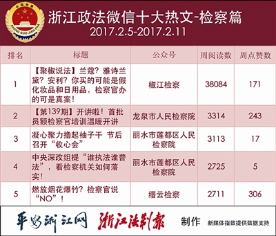 热文榜,“椒江检察”的《【聚椒说法】兰蔻?雅诗兰黛?安利?你买的可能是假化妆品和日用品,检察官办的可是真案!》以销售假品牌化妆品案例给广大消费者提了个醒,排名第一;“龙泉市人民检察院”的《【第139期】开讲啦!首批员额检察官培训温暖开讲》排名第二;“丽水市莲都区人民检察院”的《凝心聚力撸起袖子干 节后召开“收心会”》排名第三。