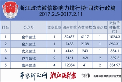 司法行政榜,以少而精著称的“武义普法”排名第三。