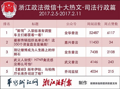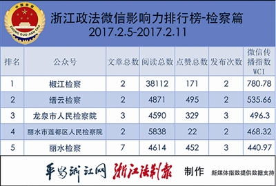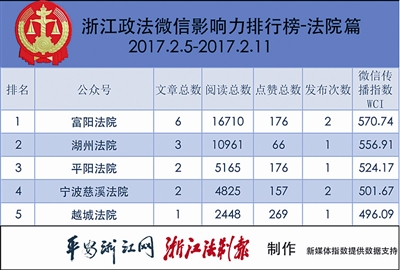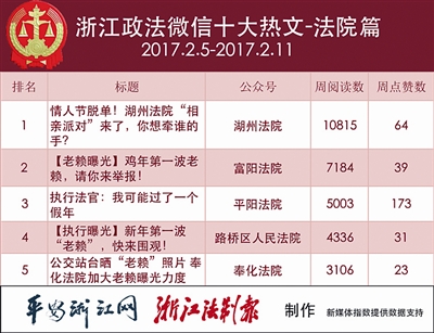 本期热文榜,“湖州法院”发布的《情人节脱单!湖州法院“相亲派对”来了,你想牵谁的手?》,不走寻常路,为法院帅哥美女们征友,吸睛不少,排名第一;“富阳法院”的《【老赖曝光】鸡年第一波老赖,请你来举报!》排名第二;“平阳法院”的《执行法官:我可能过了一个假年》以春节期间法院的执行故事吸引读者,冲上第三名。