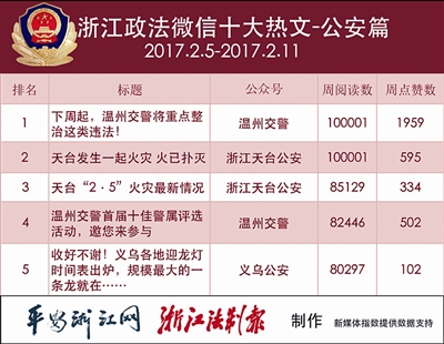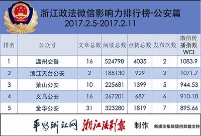 热文榜,“温州交警”的《下周起,温州交警将重点整治这类违法!》提醒市民将开展整治违规使用远光灯行动,以周阅读量10w+拔得头筹;在天台“2·5”火灾发生后,“浙江天台公安”发布的《天台发生一起火灾 火已扑灭》《天台“2·5”火灾最新情况》颇受读者关注,分别获得第二三名。