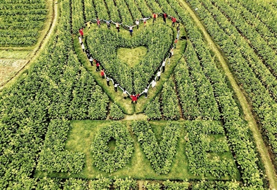 2月14日,游客在广西桂林市永福县广福乡龙溪村“心”型油菜花田里游玩。