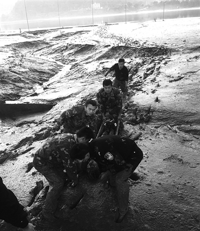 当时,瓯江刚退完潮,淤泥湿软,救援人员每走一步,整条小腿都会深深陷在里面,行进艰难。60米的救援距离,救援人员用了近半个小时才将昏迷的男子抬到防洪堤上,交给岸上的救护车。