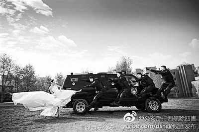 两人相恋两年了,和大部分恋人不同的是,他们曾是一个部队的战友,转业参加公安工作后,因工作原因,没有太多浪漫可言。两个月前,他们做了一件非常浪漫的事,在同事们的配合下,以特警工作生活为主题拍了一套婚纱照。