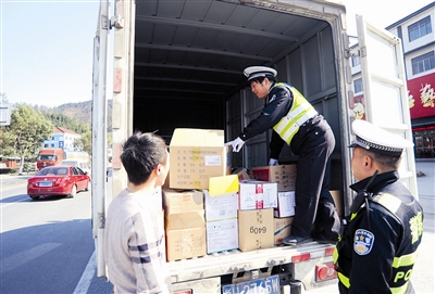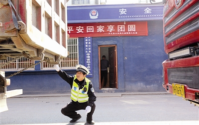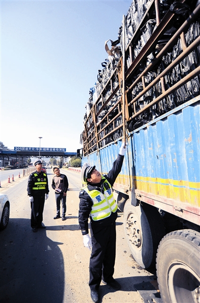 拦车、检查证件、开箱验货、测量高度、上车核对人数……省级卡点的任务枯燥而烦琐。1个多小时执勤后,老颜和同事驱车上路,开始沿着317省道上路执勤,并对沿线的一些重大工程项目内的工程车司机进行安全行车宣传。老颜说,辖区内的317省道路窄、弯多、车流大,事故多发,特别是开年后,随着工程的陆续开工,道路上的工程车越来越多。为此,最近中队每天都会派民警到现场执勤。