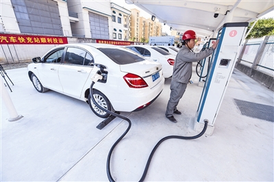 2月16日,首批引入海岛的电动汽车正在快充站充电,充满一辆电动汽车只需要一个多小时,可以行驶200多公里。