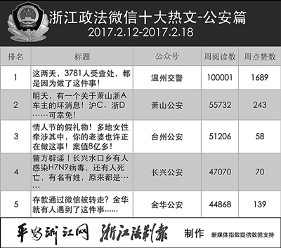 热文榜,提醒类热文获得大家的青睐,“温州交警”的《这两天,3781人受查处,都是因为做了这件事!》以10万+的阅读量再次夺得头筹;“萧山公安”的《明天,有一个关于萧山浙A车主的坏消息!沪C、浙D……可幸免!》给出萧山开学高峰期繁忙路段提示,并提醒司机们遵守交通规则,获得第二名;“台州公安”的《情人节的假礼物!多地女性牵涉其中,你的老婆也许正在做这事!案值8亿多!》获得第三名。