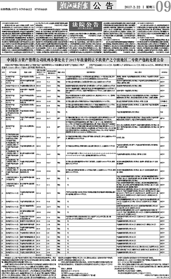 中国东方资产管理公司杭州办事处关于2017年批量转让不良资产之宁波地区二号资产包的处置公告
