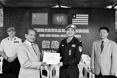 利比里亚当地时间2月21日,联合国利比里亚特派团(联利团)代表联合国向中国第四支赴利比里亚维和警察防暴队140名队员授予“和平勋章”,以表彰他们在维和行动中做出的突出贡献。