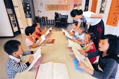 | 在济南一所私塾内,老师指导孩子们背诵《学庸论语》。 |