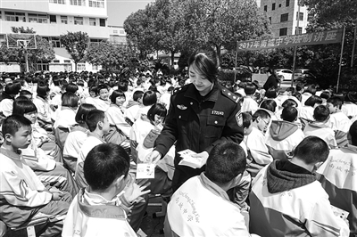 近日,台州市公安局黄岩分局城南派出所民警来到南城中学,讲解当地一些未成年人犯罪案例,通过以案释法,来警醒中学生要遵守法律。图为民警分发法治宣传资料。