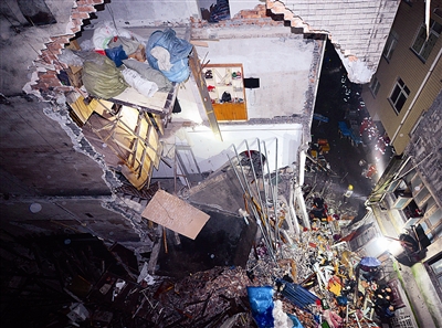 发生事故的是一幢2间4层的民房,其中一至三层已经全部塌落,四层部分墙体悬在空中,随时可能发生二次坍塌。