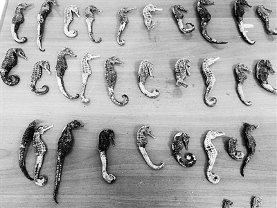 海马干是一种经济价值较高的名贵中药,具有强身健体、舒筋活络、消炎止痛等药用功能。本次截获的海马干个头不大,表面黄白色或灰棕色、略有光泽,共174只0.34kg。据旅客自述,该批海马干从南非购得,原本打算带回温州用于泡酒。