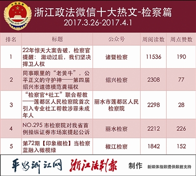 热文榜冠军由“诸暨检察”的《22年惊天大案告破,检察官提醒:激动过后,我们坚决捍卫人权》摘得。这篇文章紧跟热点,点击量可观。位居第二的是“绍兴检察”的《同事眼里的“老黄牛”,公平正义的守护神——第四届绍兴市道德模范龚福权》。从这两篇文章可以看出,“角度新”和“接地气”同样可以收获点击量。