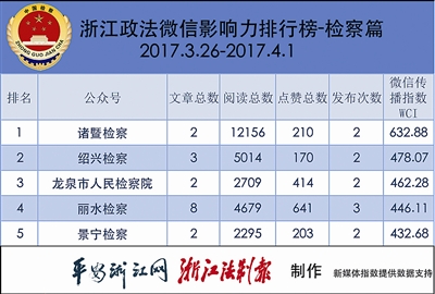 这次,检察榜的格局没有太大变动,“诸暨检察”继续领先,蝉联冠军;“绍兴检察”表现不俗,冲上榜单第二名;“龙泉市人民检察院”和“丽水检察”仍居榜单前五的位置。