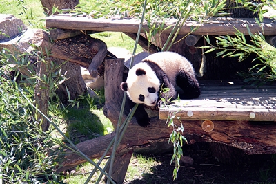 4月5日,在西班牙马德里动物园,大熊猫“竹莉娜”在熊猫馆外玩耍。