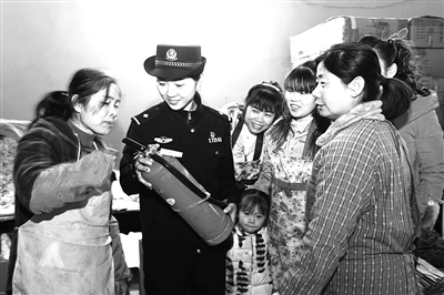近日,台州市公安局黄岩分局城南派出所的民警走进辖区,对部分工厂开展消防安全检查,了解企业开展消防安全培训情况。图为民警向工人讲解灭火器使用知识。