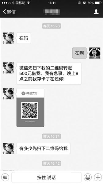 当天下午4点多,小胡正埋头工作,手机忽然收到好友小李发来的微信。打了招呼后,小李便开门见山要借钱。“微信先扫下我的二维码,转账500元借我。我有急事,晚上8点之前我存钱了再还你。”随后,小李发来一张用于微信扫码支付的二维码。