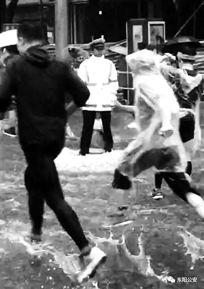 本报讯 昨天,一段关于东阳交警的视频上了央视。4月9日清晨,横店马拉松大赛在暴雨中如期举行。雨太大,跑道上有窨井盖被雨水顶起,形成涌泉。东阳市交警大队城区一中队民警陈江平和协警郭钢、钟凯鹏赶紧踩住井盖,用身体来当警示桩。
