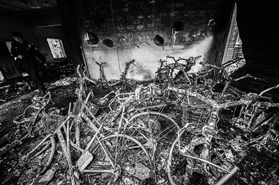 这幢砌着红色墙砖的4层楼房,几乎每扇窗户都被熏黑。记者透过底楼的窗户看到,停放在1楼的数十辆电动车及自行车在大火中被焚毁,卷闸门也被高温烤得变形,还有一个钢架结构的物件也被熏得乌黑。窗台上,在大火中融化的金属散发着苍白的光泽。