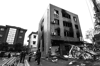 记者于10时30分来到现场,此时大火已被扑灭,警方在现场拉起了警戒线,消防和公安部门的工作人员进进出出忙碌着。