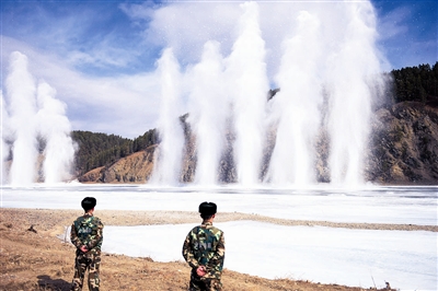 4月11日,在黑龙江省漠河县北极村,北极边防派出所官兵在黑龙江破冰爆破现场警戒。