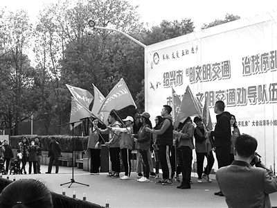 昨天上午,绍兴市开展了“创文明交通 治秩序乱象”大会战,市区万人文明交通劝导队伍出征仪式在城市广场举行,现场16个方阵300多名劝导队员整装待发。在简短的出征仪式后,各个小队前往市区各路段对违法乱象进行文明劝导,并发放文明宣传资料。