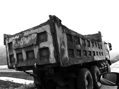 从采石场原路返回,在两车道道路靠山的一侧,便是村民举报的轧石场。成堆的石块和石子露天堆积,轰隆隆的机器声震天响。隔十几分钟,就有一辆渣土车从轧石场开出来。车上堆满了粉碎后的石子。村民说如果天晴,路面很快会铺满泥土,车进车出都会带起阵阵扬尘。
