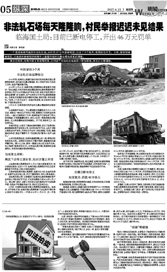 2016年12月30日,临海市国土资源局给出答复意见书表示:“经过调查,村民反映的地块属临海市红脚岩渔港投资开发有限公司于2000年建设生产的轧石场,该轧石场所用的石渣均由新塘门矿区提供,生产出来的石子用于红脚岩渔港建设。目前轧石场确实没有办理相关用地、规划手续,将依法查处。”但是,3个多月过去了,当地村民发现,轧石场依旧在运转,于是向报社投诉。