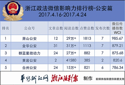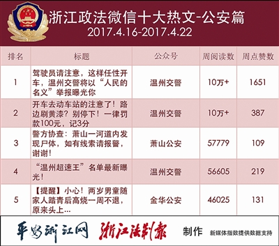 热文榜前两名都被“温州交警”包揽,并且都跟司机有关。《驾驶员请注意,这样任性开车,温州交警将以“人民的名义”举报曝光你》和《开车去动车站的注意了!路边刷黄漆?别停下!一律罚款100元,记3分》分别获得第一二名;“萧山公安”发布的《警方协查:萧山一河道内发现尸体,如有线索请报警,谢谢!》排名第三。
