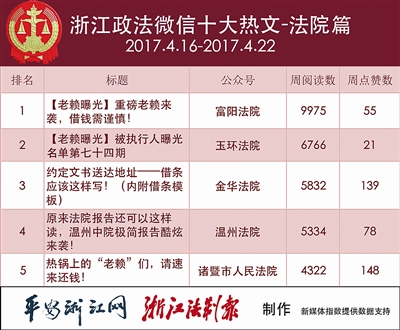 本期法院热文榜回归“老赖”主题,前两名都被“老赖曝光”占据。不过,除了老赖,热文榜也有新花样。“金华法院”的《约定文书送达地址——借条应该这样写!(内附借条模板)》专门教给读者一种借条新写法,获得较高阅读量,排名第三。
