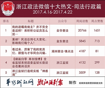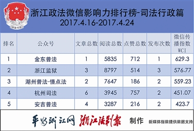 本期司法行政榜,“浙江监狱”比上期前进两名,排名第二,“湖州普法-懂点法”排名第三。
