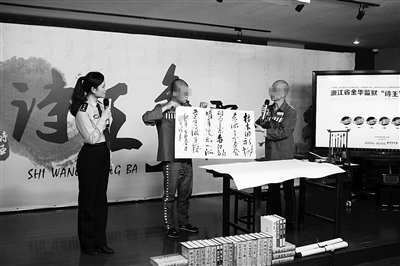 在省金华监狱举办的服刑人员“诗王争霸赛”上,三支竞争团体冠军的决赛队伍正上演紧张的诗词飞花令。
