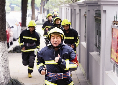 近2个小时的水带操训练结束,官兵们累到了极点,但朱百洪的训练计划还没结束。他让全体官兵到车库换上战斗服,由他带队绕着中队周边的道路跑圈,全程5公里。
