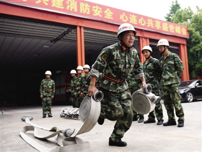 4月25日上午,记者来到复兴消防中队时,朱百洪正带着中队官兵在操场上进行一人三带水带操训练。只见朱百洪拿过一旁的3盘水带放到起跑线上,然后快速抓起中间的水带甩了出去,在将接口卡入分水器后,提起水带就冲了出去,动作一气呵成。