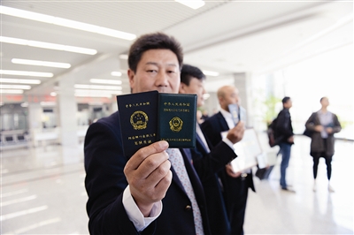 4月27日,首汽约车司机在北京市政务服务中心向记者展示他领取的《网络预约出租汽车驾驶员证》和《网络预约出租汽车运输证》。