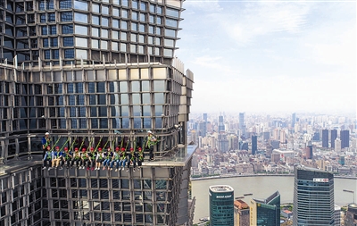五一小长假期间,上海东方明珠广播电视塔、金茂大厦、上海环球金融中心、上海中心大厦等高层地标建筑推出空中旅游项目,游客身着防护设备,在百米高的空中步道体验“云中漫步”,俯瞰黄浦江和浦东陆家嘴全貌。