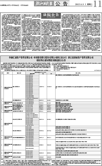 华融汇通资产管理有限公司 中国建设银行股份有限公司浙江省分行 浙江省浙商资产管理有限公司 债权转让通知暨债务催收联合公告