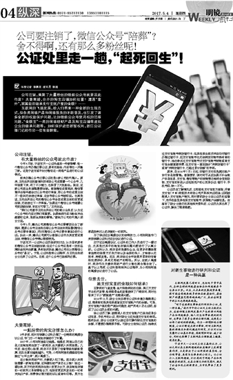 今年4月初,宁波市天一公证处遇到一件新鲜事:给一个微信公众号办理迁移公证,原有的粉丝、内容等也一并搬了家。这是宁波市首次针对微信这一网络产品进行的公证尝试。