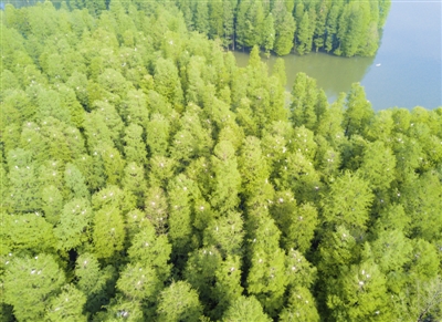 从航拍器的镜头可以看到,密密麻麻的白鹭鸟在池杉林筑巢栖息。
