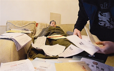 | 3月9日,四川省成都市童子街,胡效敏的家人找出各种投资证明。胡效敏老人现在瘫痪在床,从2011年到2016年,他陆续在保健品、基金、股权等项目上被骗100多万元,直到脑梗后才对家人说出实情。 |