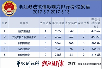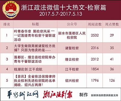 本期检察院热文榜以“互动”“联谊”为主,“丽水市莲都区人民检察院”的《吟青春华章 展检察风采 ——记莲缙青年检察干警联谊活动》、“缙云检察”的《莲都区、缙云县检察院举办青年干警联谊活动》、“江干检察”的《钱潮论剑 江干启航》分别获得第一名、第三名、第四名,看来大家对展现检察官柔情一面的文章颇感兴趣。另外,“诸暨检察”的《大学生做微商被诸暨检方批捕?只因为他卖的是……》发布了典型案例,标题吸引眼球,获得第二名。