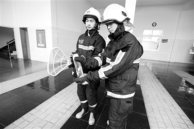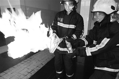 实验开始,1名全副武装的消防员手持电蚊拍,并将电蚊拍开关打开,而另1名消防员则将3种品牌的杀虫剂瓶口对准电蚊拍网面进行依次喷射实验,时长均为15秒左右。